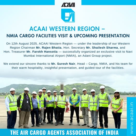 On 12th August 2025, The Air Cargo Agents Association of India – ACAAI Western Region — under the leadership of our Western Region Chairman Mr. Rajen Bhatia, Hon. Secretary Mr. Shailesh Sharma, and Hon. Treasurer Mr. Farokh Hansotia — successfully organized an exclusive visit to Navi Mumbai International Airport (NMIA), an Adani Group project.The visit provided the […]